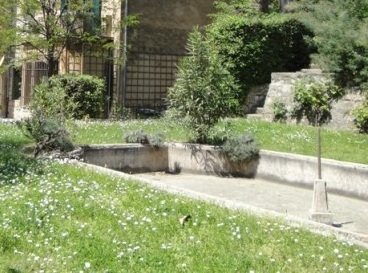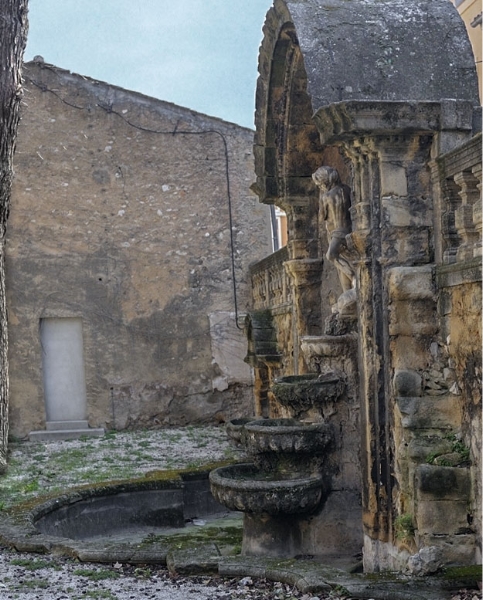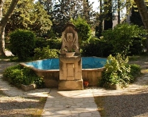 Dans la cours de l'hotel Bonnet de la Baume construit en 1789 au 2 rue Goyrand, cette fontaine est partiellement sous la végétation |